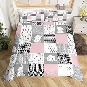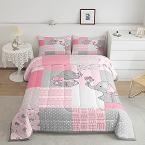 Girly Cute Elephant Full Size Comforter Set,Pink Gray Plaid Geometric Bedding Comforters Bedroom Collection,Cartoon Animals Stripes Dots Bedding Set for Girls Teens